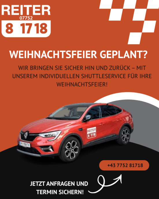 Für Fragen erreichen Sie uns unter +43 7752 81718 oder per E-Mail an business@nulltaxi-reiter.at.